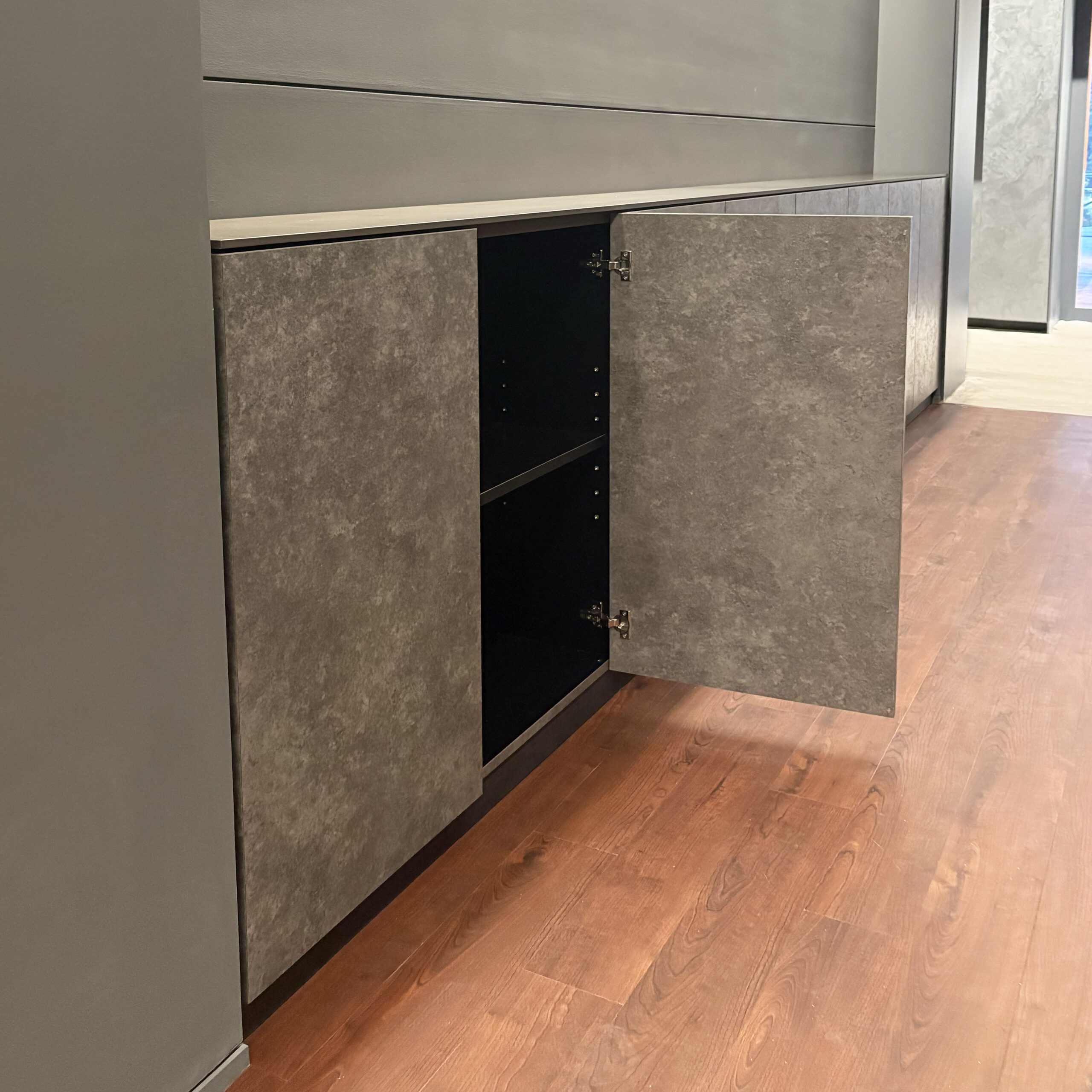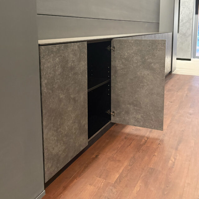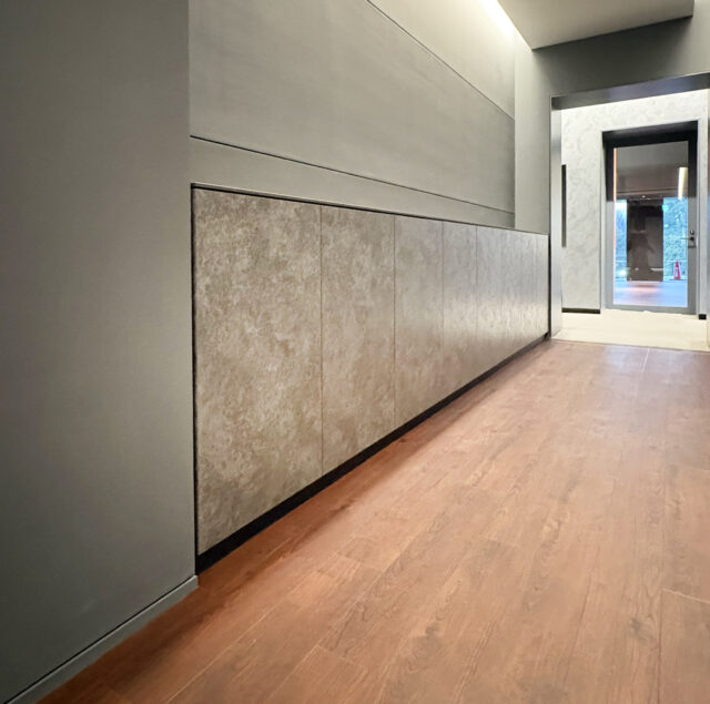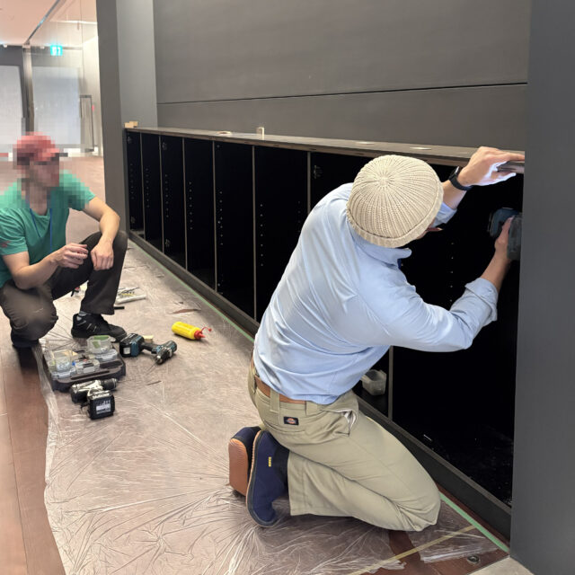 非常にシンプルな見た目ですが、来場客が扉などを触らないような見た目の工夫などしており特にショップ什器の家具は、開閉部分の場所とそうでない場所が一見分からないようにコーナー部のトメのディティール造作は結構攻めた造りになっています。